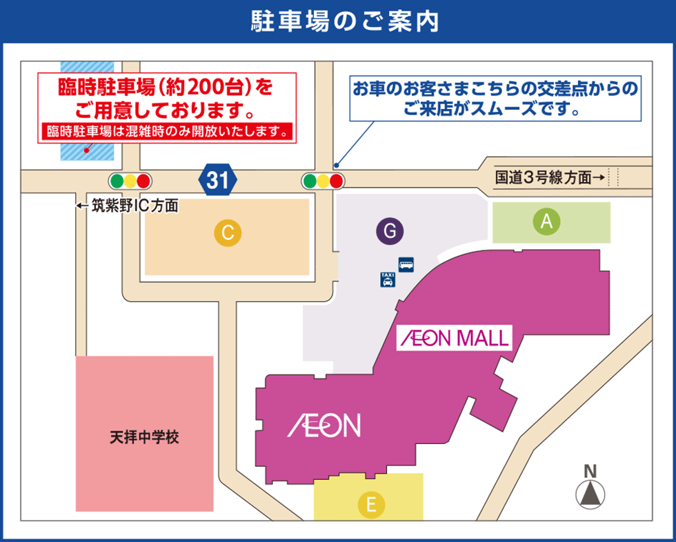 イオンモール筑紫野では、バス発着予定表を申請された方に、一般駐車場内に、無料のバス駐車スペースをご用意させていただいております。